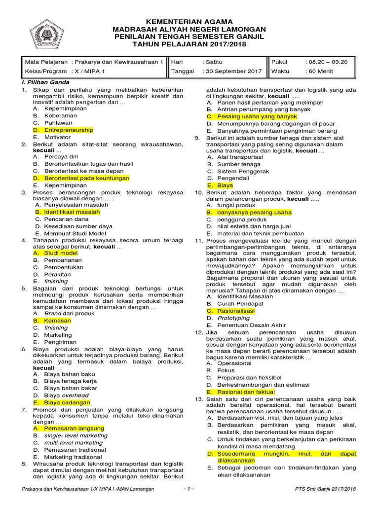 Soal Pilihan Ganda Prakarya Dan Kewirausahaan Kelas X Semester 1 : Soal Uts Pts Prakarya Kwu Kelas 10 Semester 2 Tahun 2021 Andronezia - Soal pkn kelas 9 semester 1.. Perbedaan pengertian prakarya dan kewirausahaan 1. Berikut ini adalah contoh soal essay mata pelajaran prakarya dan kewirausahaan (pkwu) untuk kelas 12 semester ganjil. 5prakarya dan kewirausahaan untuk mengungkapkan pengetahuan dan pengalaman yang telah kamu miliki terkait dengan materi yang akan dipelajari. Buku siswa kelas 11 prakarya dan kewirausahaan semester 1 dan 2. Produk kreatif dan kewirausahaan atau biasa disingkat pkkwu merupakan salah satu mata pelajaran produktif yang diajarkan di sekolah men.
