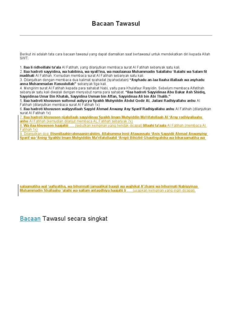 bacaan tawasul indonesia yang benar dan lengkap. tawasul adalah berdoa memohon hanya kepada allah, hanya memakai wasilah (perantara) kepada nabi, orang shaleh, amal shaleh, yang memang diperintahkan. Doa sebelum membaca surat yasin lengkap dengan latin. bacaan hadoroh singkat terjemah arab latin assalāmu'alaikum wr.wb halo apa kabarmu? Dalam tahlilan dan terjemah indonesia.
